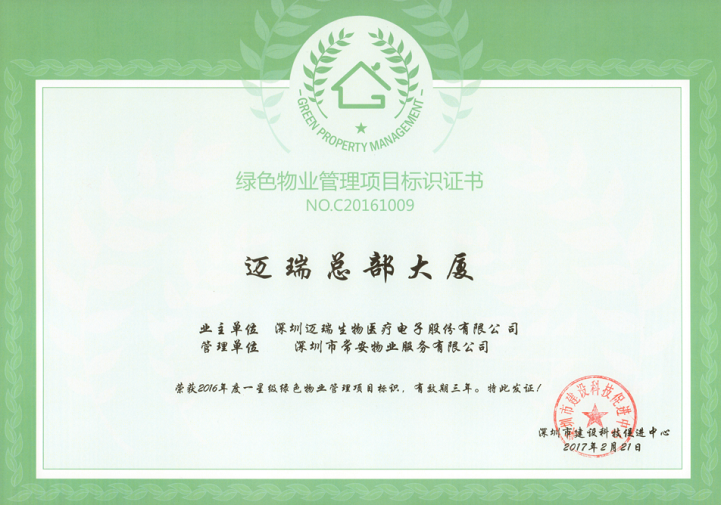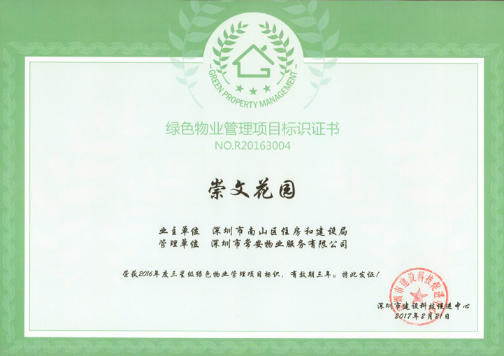 為落實(shí)深圳市住建局關(guān)于《深圳市綠色物業(yè)管理導(dǎo)則(試行)》指導(dǎo)精神,在保證物業(yè)服務(wù)質(zhì)量等基本要求的前提下,通過科學(xué)管理、技術(shù)改造和行為引導(dǎo),有效降低各類物業(yè)運(yùn)行能耗,最大限度地節(jié)約資源和保護(hù)環(huán)境,致力構(gòu)建節(jié)能低碳生活社區(qū)的物業(yè)管理活動(dòng),實(shí)現(xiàn)城市經(jīng)濟(jì)社會(huì)可持續(xù)發(fā)展目標(biāo),提高物業(yè)管理的科技含量和服務(wù)水平。201612月,在公司的正確領(lǐng)導(dǎo)和相關(guān)部門的積極配合下,通過項(xiàng)目全體員工的共同努力,我司“崇文花園”項(xiàng)目和“邁瑞總部大廈”項(xiàng)目順利通過了深圳市建設(shè)科技促進(jìn)中心的相關(guān)評(píng)審,分別獲得了“2016年度三星級(jí)綠色物業(yè)管理項(xiàng)目”證書和“2016年度一星級(jí)綠色物業(yè)管理項(xiàng)目”證書。