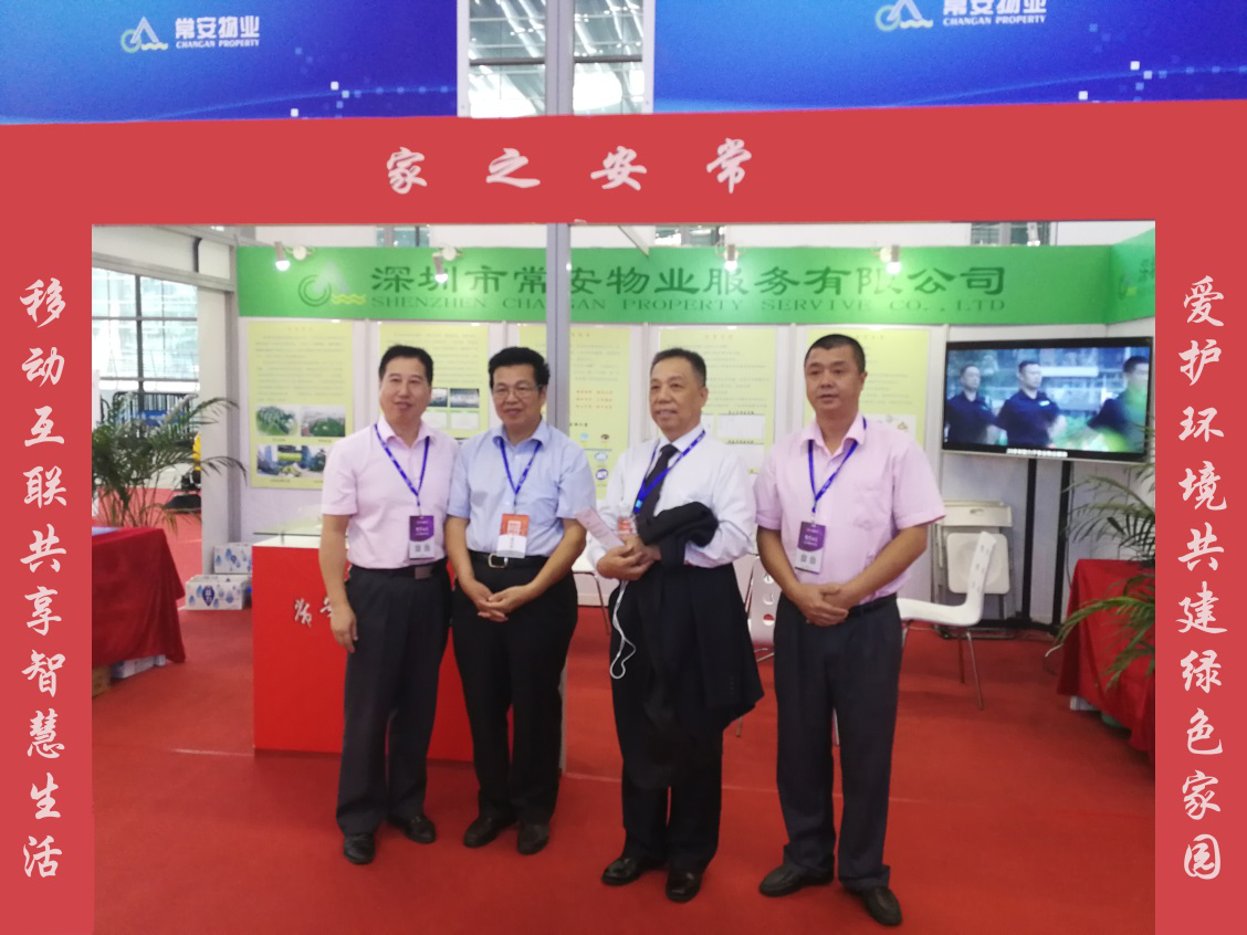 中國物業(yè)管理協(xié)會會長沈建忠及深圳市物業(yè)管理協(xié)會會長曹陽在常安物業(yè)公司展位前合影留戀